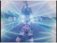 Rocky calls for Zeo Ranger 3, Blue, as said color energy flashes about, a green grid overlaying on his body. The rising energy covers him completely, becoming the Blue Zeo Ranger, visor and costume circuits shimmering with power. |