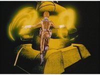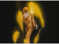 In front of a yellow glowing dogu statue, Yellow Ranger spins around while hovering, whipping her Zeo Power Weapons about, the nunchucks glowing with yellow energy as she does. |
