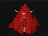 Close on Red, looking at our upper slight left, then our upper slight right, talking into wrist, then motioning arms about, releasing red energy briefly as he summons. |