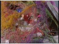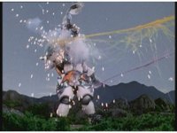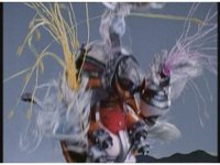 Zeo Megazord, already profusely covered, gets more silly string added to its struggling form. |