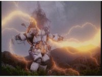 Against black backdrop, Zeo MegaBattlezord's shoulder fist-cannons piston in and out, crackling with yellow electricity and shimmering, before firing energy blasts forth. |