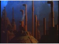 Close pan left across Machine Empire Skybase, its copper-colored industrial piped buildings spewing smoke into the lunar atmosphere. |