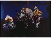 King Mondo talks to our slight left in front of Earth cut-out, then pan down to Prince Sprocket, who turns around, and excitedly talks to our slight upper left, motioning arms widely. |