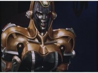 Beside the viewscreen, King Mondo talks, motioning hand and staff. Then slow zoom in on King Mondo's face, still talking, rising up and down and motioning arm and staff out of frame while doing so. |