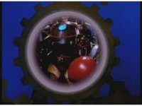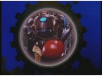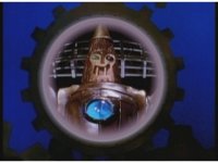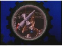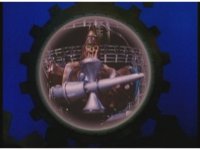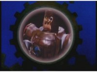 Slow zoom in over the rotating gearworks of the Machine Skybase onto King Mondo, who paces back and forth, talking, motioning his staff about, while Klank, Orbus, Prince Sprocket, and Queen Machina hang around to our left. |