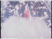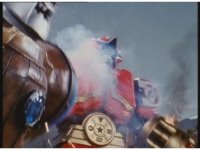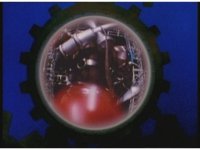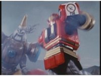 Red Battlezord is launched from cannon at Zord hangar, into a speeding twirl through the sky. |
