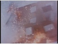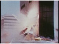 Lower corner floor of building erupts into an explosion, destroying nearby yellow car. |