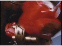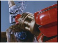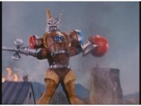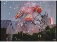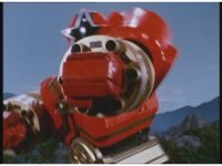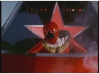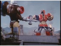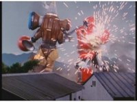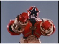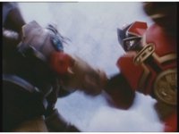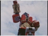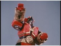 Pan up as Red Battlezord lands, spreads arms, then punches right fist slowly skyward in triumph. |