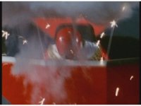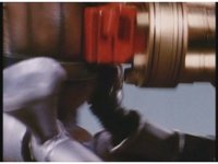 Red Battlezord cockpit spark and smoke bursts again, knocking Red about. |