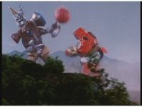 Pan up as Red Battlezord makes with the fancy footwork and eager boxing stance punching gestures. |