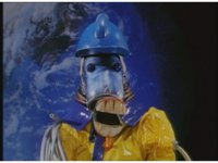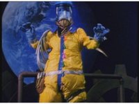 Close on King Mondo, by Earth cut-out's edge, talking at us, motioning left arm about as he speaks. |