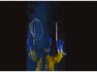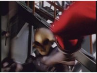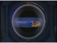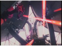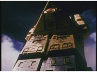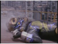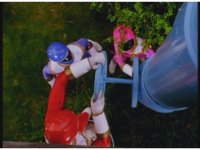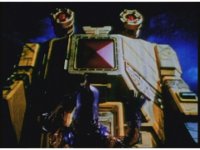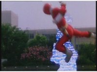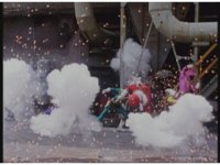 Red Battlezord is launched from cannon at Zord hangar, into a speeding twirl through the sky. |