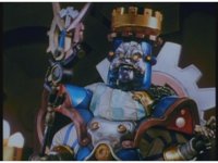Zoom in past Queen Machina, to King Mondo talking in front of clockwork wall, Prince Sprocket behind him. |