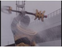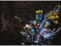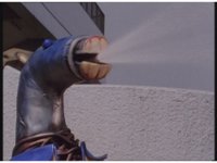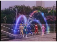 Leaky Faucet turns to us, taunts, zoom out as he rushes up onto steps, the five Rangers approaching, when he suddenly beings to release fountains of rainbow colored energy-water upon the team. |