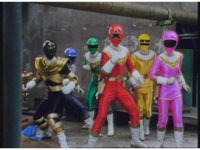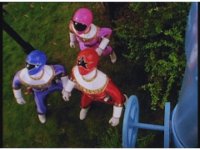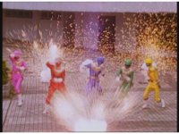 As a team, all five Rangers flip over, high in the air, in perfect formation and timing. |