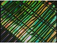 Shot of oil slick beneath a grate, reflecting the sun. |