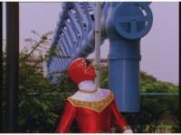 Tommy calls for Zeo Ranger 5, Red, as said color energy flashes about, a green grid overlaying on his body. The rising energy covers him completely, becoming the Red Zeo Ranger, visor and costume circuits shimmering with power. |