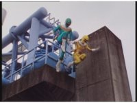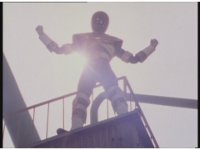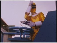 Zoom in, upward, onto Gold Ranger, standing in sunlight on edge of structure. |