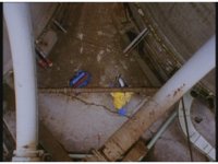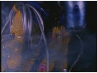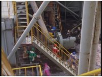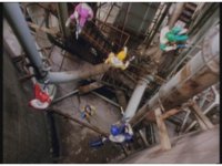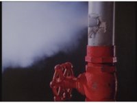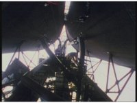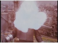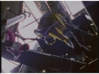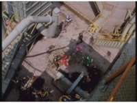 Atop the pipe scaffolding, Green turns knob on volumeter, then looks to our left, whip pan that way. |