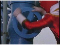 In Red Battlezord cockpit, Red crosses arms, then spreads them out and forth, before grabbing controls. |