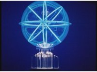 Pan up on column with blue neon atomic symbol orb like Rita used to have on her balcony. |