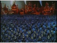 Zoom in on King Mondo, beside Earth cut-out, talking to our slight right, his staff passing in our way several times. |
