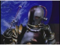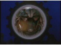 Close-up on Cog's face as its eye region slides up, exposing clockwork eyes. Cut to extreme close-up of its eyes as they flash with energy being released. |