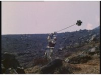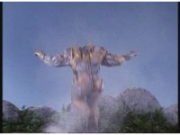 Close on King Mondo, by Earth cut-out's edge, talking at us, motioning left arm about as he speaks. |
