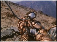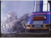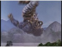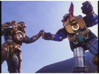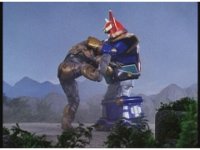 Near Zeo Megazord's right foot, Borax pops up out of the dirt and smacks its leg out from under it, causing it to fall and roll away. |