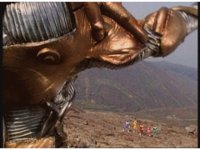 Far, side angle follow-along, of the whole fleet of five Zeozords making their way to our left along a desolate, dusty terrain. |