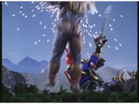 Repeat, closer, of Zeo Megazord slashing the Saber down at the screen. |