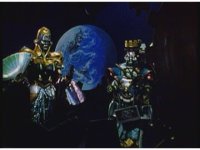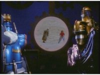 King Mondo & Queen Machina watch Super Zeozords posing on the viewscreen, the Queen appearing agitated. |