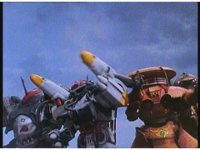 Super Zeozord Five whips out its Super Power Sword, and slashes the approaching missiles to shreds. |
