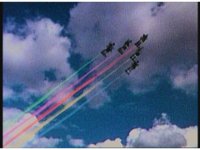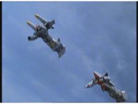 The five Super Zeozords soar through the sky, side by side formation, leaving contrails of Ranger colors. |