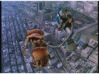 High above the city, Hose Head has Super Zeozord Three in its tentacled grip. |