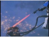 Downward angle on Goldar and Red Ranger sparkily slashing each other, Blade Blaster against sword. |