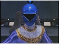 Rocky calls for Zeo Ranger 3, Blue, as said color energy flashes about, a green grid overlaying on his body. The rising energy covers him completely, becoming the Blue Zeo Ranger, visor and costume circuits shimmering with power. |