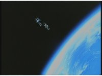 As a Gearship rises up in front of the screen, push forth and pan up along the orangey surface of the moon, stopping on a far exterior of the Machine Empire Skybase against the profile of the Earth. Quadrafighters walking to our right, others flying to our left in the distance, Gearships hovering about, and a group of Cogs walking on some scaffolding. |