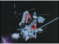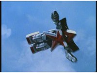 Super Zeozord Five soars away from the brief explosion, and reenters the Earth's atmosphere. |