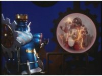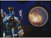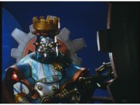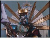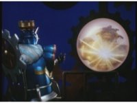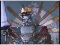 Queen Machina & Prince Sprocket watch from the sidelines, as King Mondo slashes his Damocles Sword at Super Zeo Megazord. |
