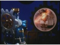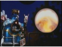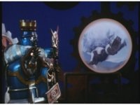Zoom in across the rotating gearworks, onto King Mondo in front of Earth cut-out, talking profusely, with some staff motioning and attention to our left. |