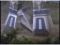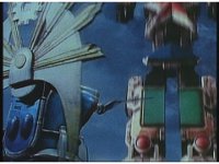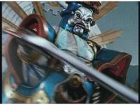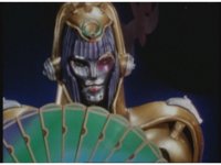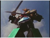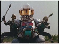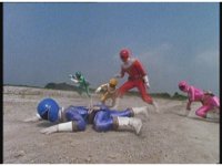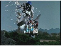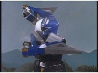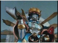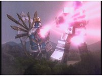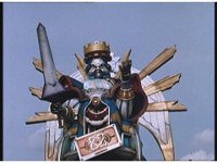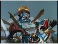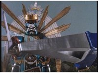 King Mondo staggers back, then slashes again, prompting the Super Zeo Megazord to disengage into its component parts, narrowly avoiding getting hit by the sword, to Mondo's surprise. |