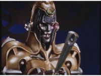 Jason shouts for Gold Ranger Power, uncrosses arms, as said color energy flashes about, a green grid overlaying on his body. The rising energy covers him completely, becoming the Gold Ranger, visor and costume circuits shimmering with power. |