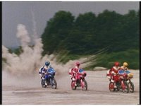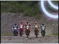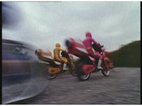 The five Rangers ride their Zeo Jet Cycles down a deserted road. |