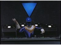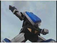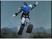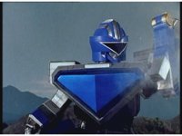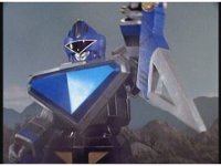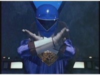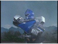 Rocky calls for Zeo Ranger 3, Blue, as said color energy flashes about, a green grid overlaying on his body. The rising energy covers him completely, becoming the Blue Zeo Ranger, visor and costume circuits shimmering with power. |