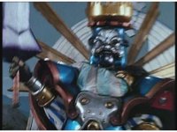 Super Zeozord Three is now armed with its Super Power Weapons, a cleaver against each forearm, and charges forth into battle with the Damocles Sword-wielding King Mondo. |