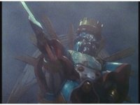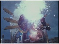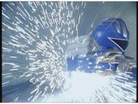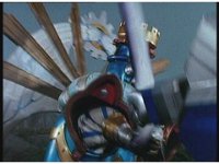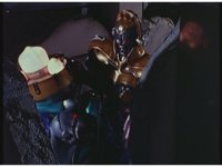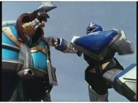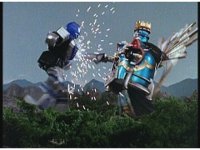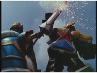 King Mondo sparkily slashes the Damocles Sword at Super Zeozord Three, repeatedly. Though it blocks a few times and gets in a few hits, its own blows are ultimately futile. |