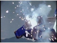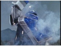 His Super Zeozord cockpit smoke and spark bursts, zoom in as Blue motions arms about and hits switch. |
