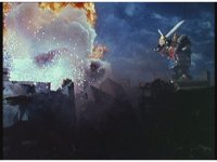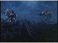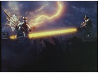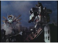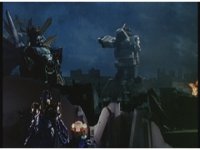 Facing each other across the smokey ruins of the darkened city, King Mondo and Super Zeo Megazord stand battle ready. |