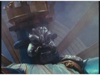 Push in upward on giant King Mondo, talking, gesturing Damocles Sword and hand about. |